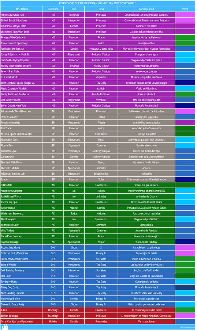 Referencias: MK: Magic Kingdom – EP: Epcot – DHS: Hollywood Studios – AK: Animal Kingdom-TL: Typhoon Lagoon -BB:Blizzard Beach