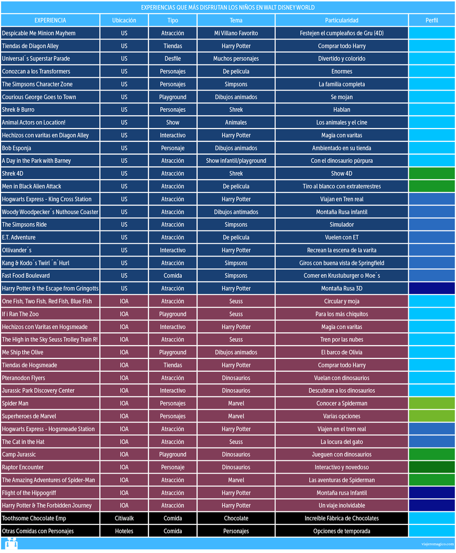 Sobre cada atracción listada en el cuadro encontrarán la siguiente información: a qué parque pertenece, en qué franquicia o familia de franquicias se apoya, el tipo de experiencia, alguna nota especial.
