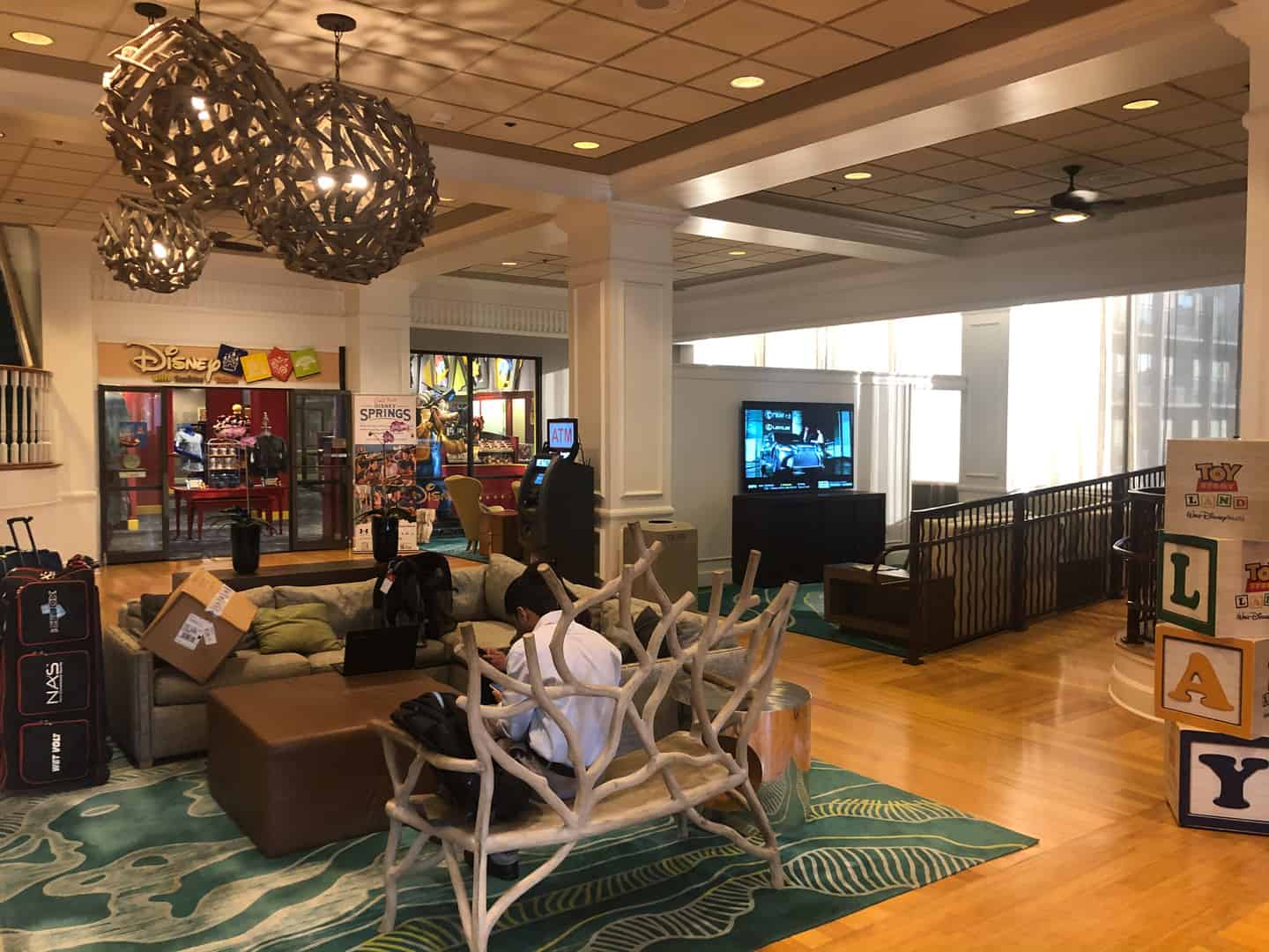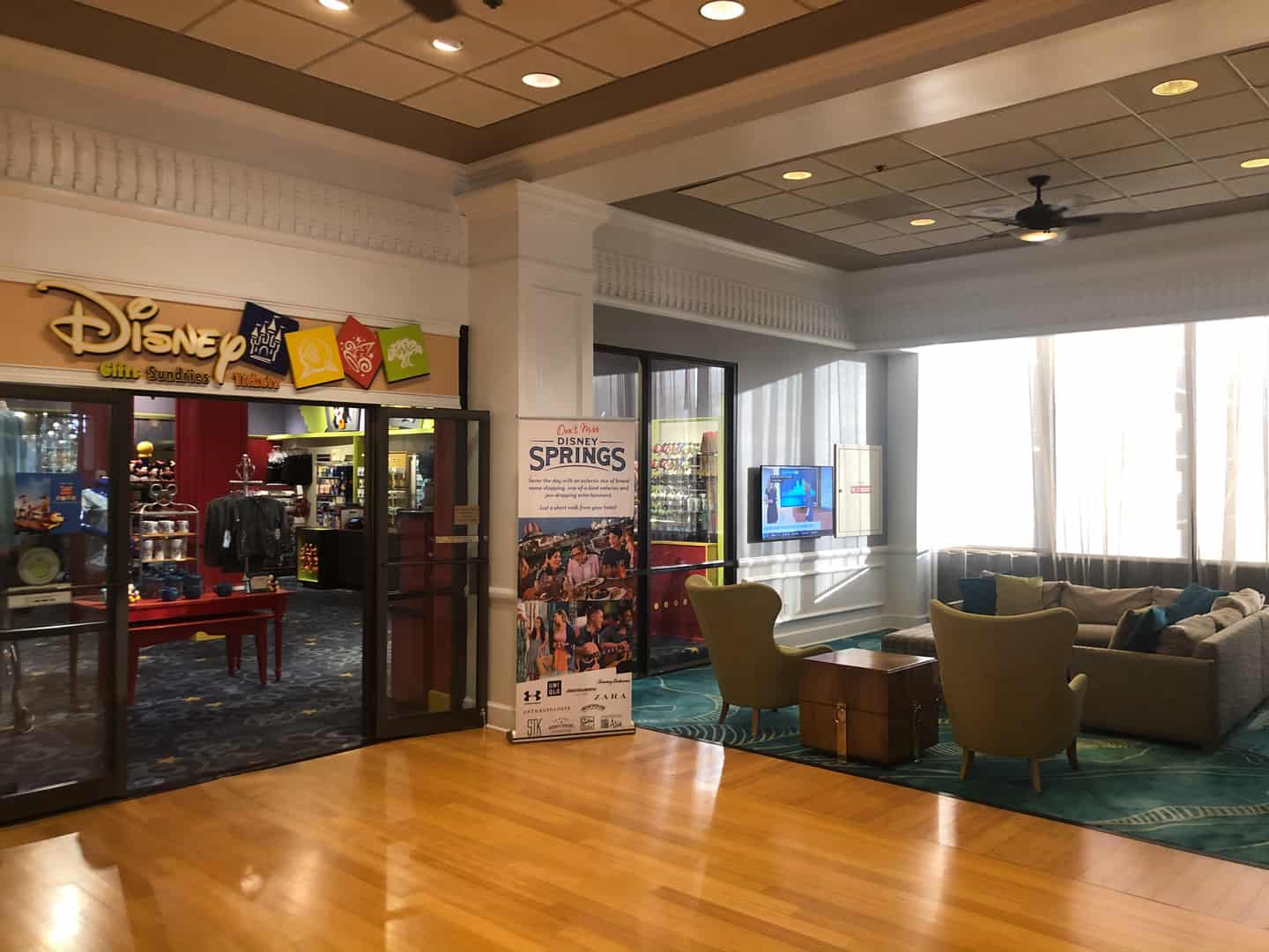 El lobby cuenta con una tienda oficial Disney, varios espacios de descanso con sillones.